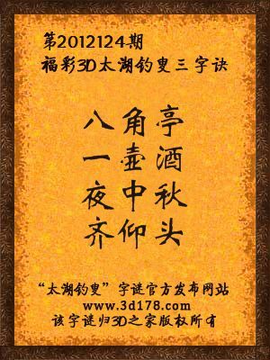 福彩3D第12124期太湖字谜:八角亭,一壶酒,夜中秋,齐仰头