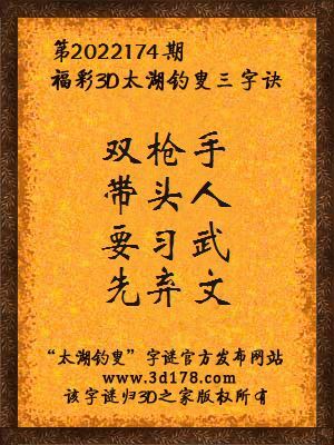 福彩第2022174期3d太湖字谜:双枪手,带头人,要习武,先弃文