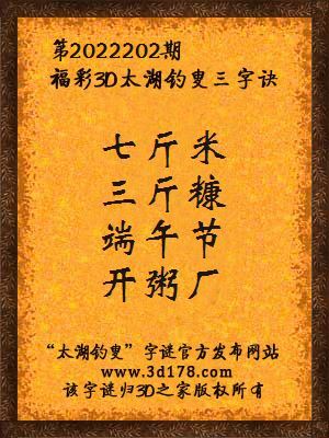 福彩第2022202期3d太湖字谜:七斤米,三斤糠,端午节,开粥厂