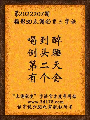 3d马前屁解太湖字谜第2022207期:喝到醉,倒头睡