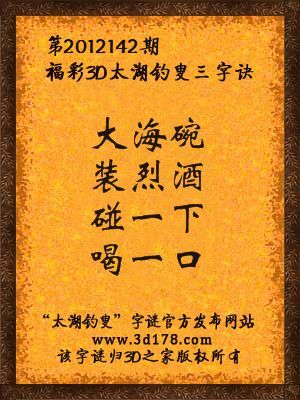 福彩3D第12142期太湖字谜:大海碗,装烈酒,碰一下,喝一口