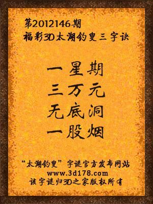 福彩3D第12146期太湖字谜:一星期,三万元,无底洞,一股烟