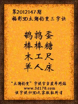 福彩3D第12147期太湖字谜:鹌鹑蛋,棒棒糖,木工尺,单人床