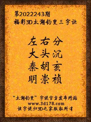 福彩第2022243期3d太湖字谜:左右分,大头沉,秦胡亥,明崇祯