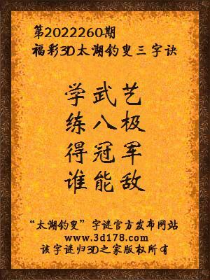 福彩第2022260期3d太湖字谜:学武艺,练八极,得冠军,谁能敌
