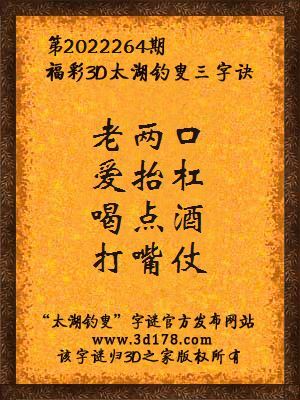福彩第2022264期3d太湖字谜:老两口,爱抬杠,喝点酒,打嘴仗