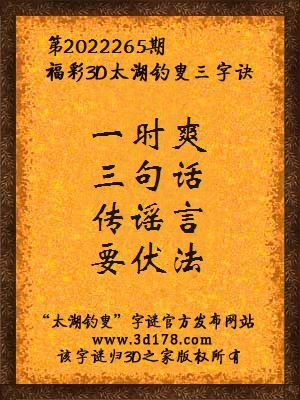 福彩第2022265期3d太湖字谜:一时爽,三句话,传谣言,要伏法