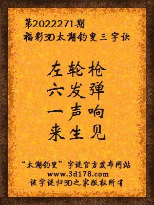 福彩第2022271期3d太湖字谜:左轮枪,六发弹,一声响,来生见