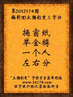 福彩3D第12174期太湖字谜:捅窗纸,举金樽,一个人,左右分
