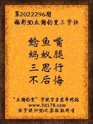 福彩第2022296期3d太湖字谜:鲶鱼嘴,蚂蚁腿,三思行,不后悔