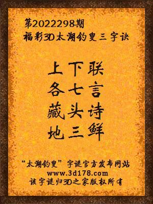 福彩第2022298期3d太湖字谜:上下联,各七言,藏头诗,地三鲜