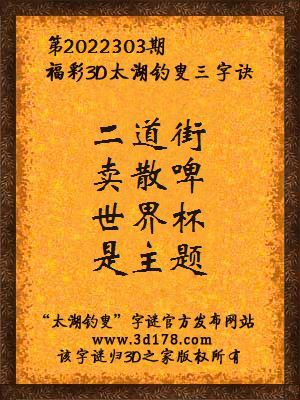 福彩第2022303期3d太湖字谜:二道街,卖散啤,世界杯,是主题