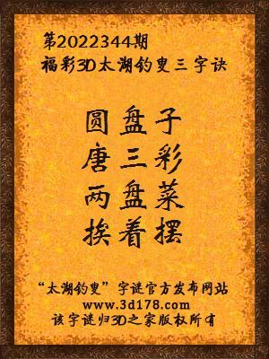 福彩第2022344期3d太湖字谜:圆盘子,唐三彩,两盘菜,挨着摆