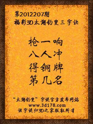 福彩3D第12207期太湖字谜:枪一响,八人冲,得铜牌,第几名