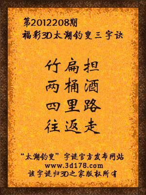 福彩3D第12208期太湖字谜:竹扁担,两桶酒,四里路,往返走
