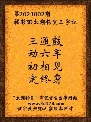 福彩第2023002期3d太湖字谜:三通鼓,动六军,初相见,定终身