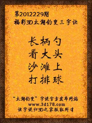 福彩3D第12229期太湖字谜:长柄勺,看大头,沙滩上,打排球