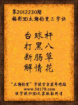 福彩3D第12230期太湖字谜:台球杆,打黑八,断肠草,解情花