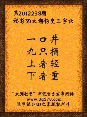 福彩3D第12238期太湖字谜:一口井,九只桶,上者轻,下者重