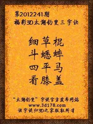 福彩3D第12241期太湖字谜:细草棍,斗蟋蟀,四平马,看膝盖