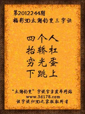 福彩3D第12244期太湖字谜:四个人,抬轿杠,穷光蛋,下跳上