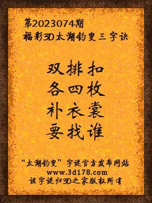 福彩第2023074期3d太湖字谜:双排扣,各四枚,补衣裳,要找谁