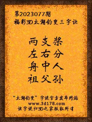 福彩第2023077期3d太湖字谜:两支桨,左右分,舟中人,祖父孙