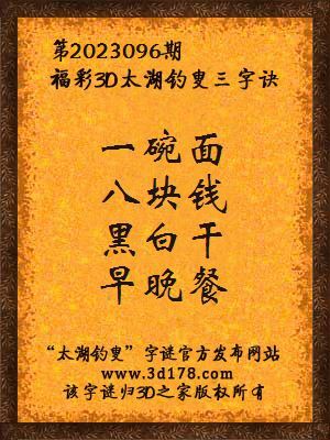 福彩第2023096期3d太湖字谜:一碗面,八块钱,黑白干,早晚餐