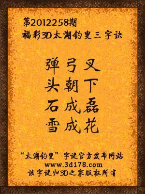 福彩3D第12258期太湖字谜:弹弓叉,头朝下,石成磊,雪成花