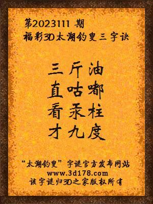 福彩第2023111期3d太湖字谜:三斤油,直咕嘟,看汞柱,才九度