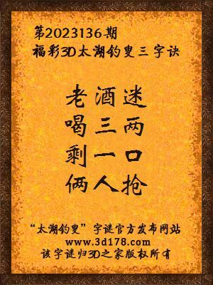 3d马前屁解太湖字谜第2023136期:老酒迷,喝三两