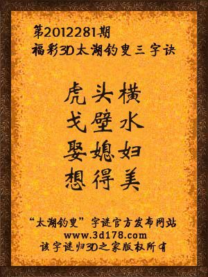 福彩3D第12281期太湖字谜:虎头横,戈壁水,娶媳妇,想得美