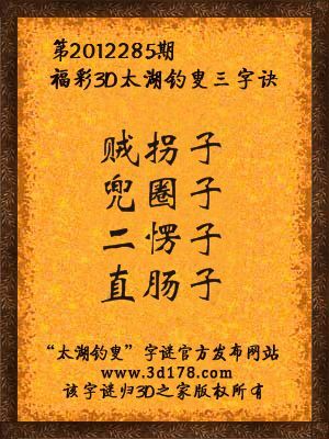 福彩3D第12285期太湖字谜:贼拐子,兜圈子,二愣子,直肠子