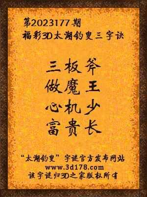 福彩第2023177期3d太湖字谜:三板斧,做魔王,心机少,富贵长