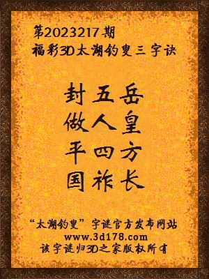 福彩第2023217期3d太湖字谜:封五岳,做人皇,平四方,国祚长