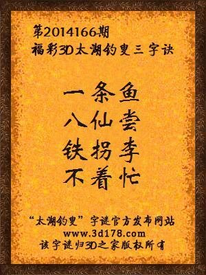 2014年福彩3d第166期太湖钓叟字谜:一条鱼,八仙尝,铁拐李,不着忙