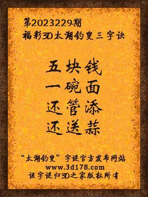福彩第2023229期3d太湖字谜:五块钱,一碗面,还管添,还送蒜