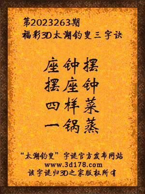 下面开始解3d第2023263期太湖字谜:座钟摆,摆座钟,四样菜,一锅蒸