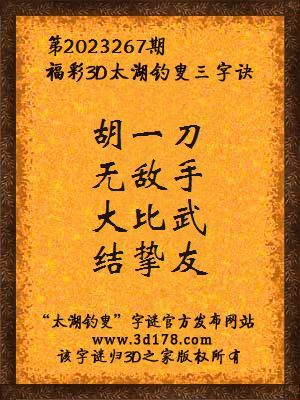 下面开始解3d第2023267期太湖字谜:胡一刀,无敌手,大比武,结挚友