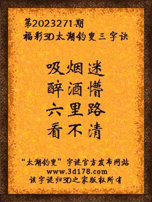 福彩第2023271期3d太湖字谜:吸烟迷,醉酒懵,六里路,看不清