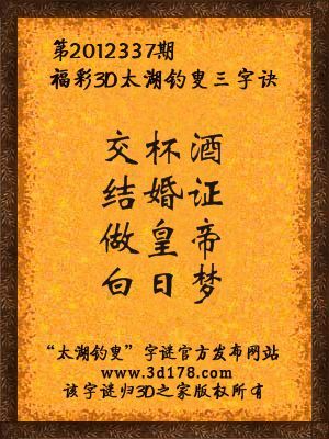 福彩3D第12337期太湖字谜:交杯酒,结婚证,做皇帝,白日梦