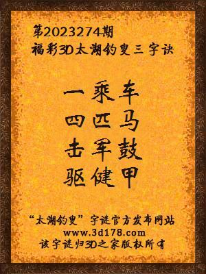 福彩第2023274期3d太湖字谜:一乘车,四匹马,击军鼓,驱健甲
