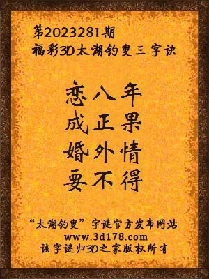 福彩第2023281期3d太湖字谜:恋八年,成正果,婚外情,要不得
