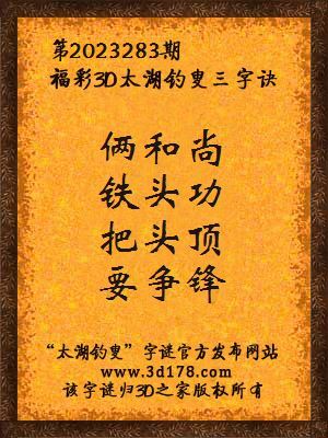 福彩第2023283期3d太湖字谜:俩和尚,铁头功,把头顶,要争锋