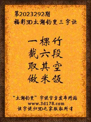 福彩第2023292期3d太湖字谜:一棵竹,截六段,取其空,做米饭