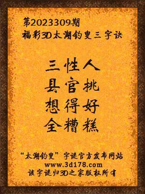 福彩第2023309期3d太湖字谜:三性人,县官挑,想得好,全糟糕