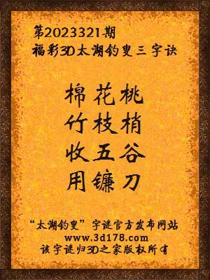 福彩第2023321期3d太湖字谜:棉花桃,竹枝梢,收五谷,用镰刀