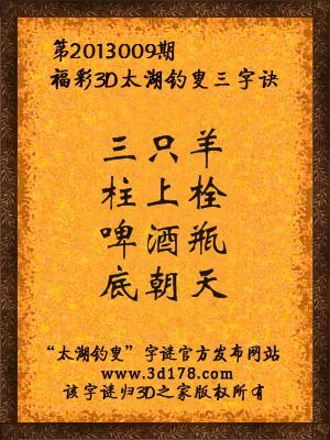 福彩3D第13009期太湖字谜:三只羊,柱上栓,啤酒瓶,底朝天