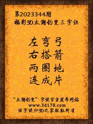福彩第2023344期3d太湖字谜:左弯弓,右搭箭,两圈地,连成片