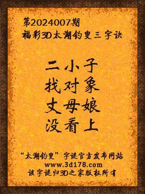 福彩第2024007期3d太湖字谜:二小子,找对象,丈母娘,没看上